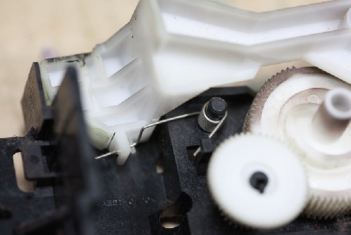 Разбирается узел парковки путём разделения на две половины. При разделении будьте осторожны и не потеряйте внутренние части механизма. В основном причиной поломки является неисправная пружина на стопоре каретки.
