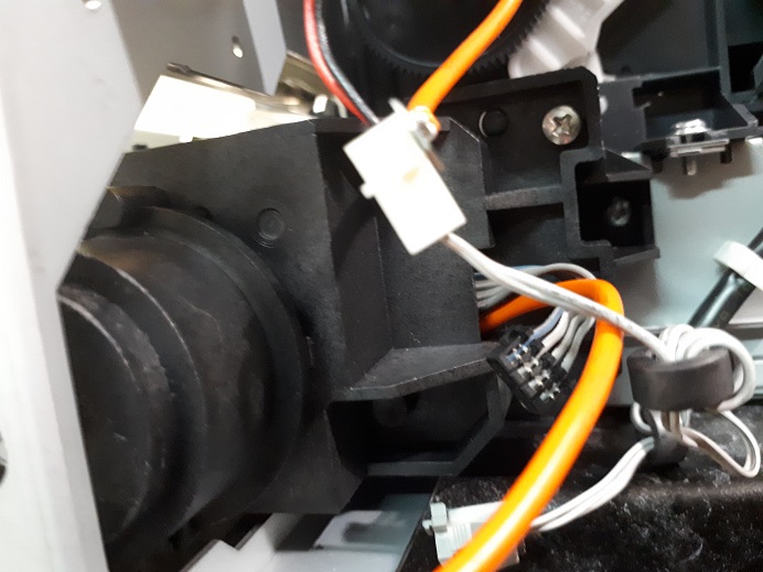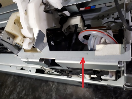Следующим шагом снимаем скобу в правой части станины открутив два винта по бокам. Далее отсоединяем провода парковочного узла и вынимаем его, перед этим освободив парковочный узел от винтов крепления.