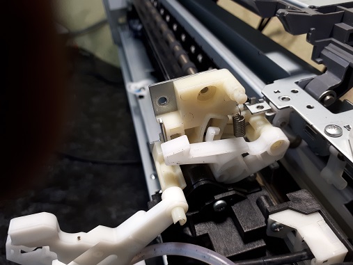 Причина в том, что не двигается белый пластиковый стопор головки в узле парковки из-за поломки пружины, которая выдвигает его вверх и блокирует каретку.