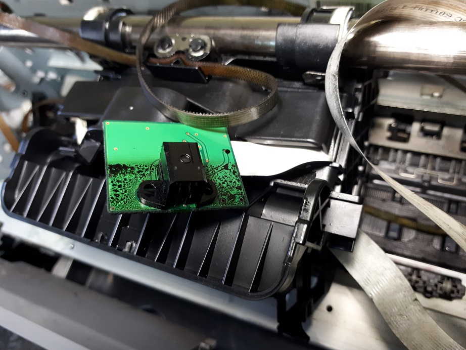Сам датчик расположен под крышкой и соединен с платой датчика энкодера, который находится сзади каретки под крышкой.