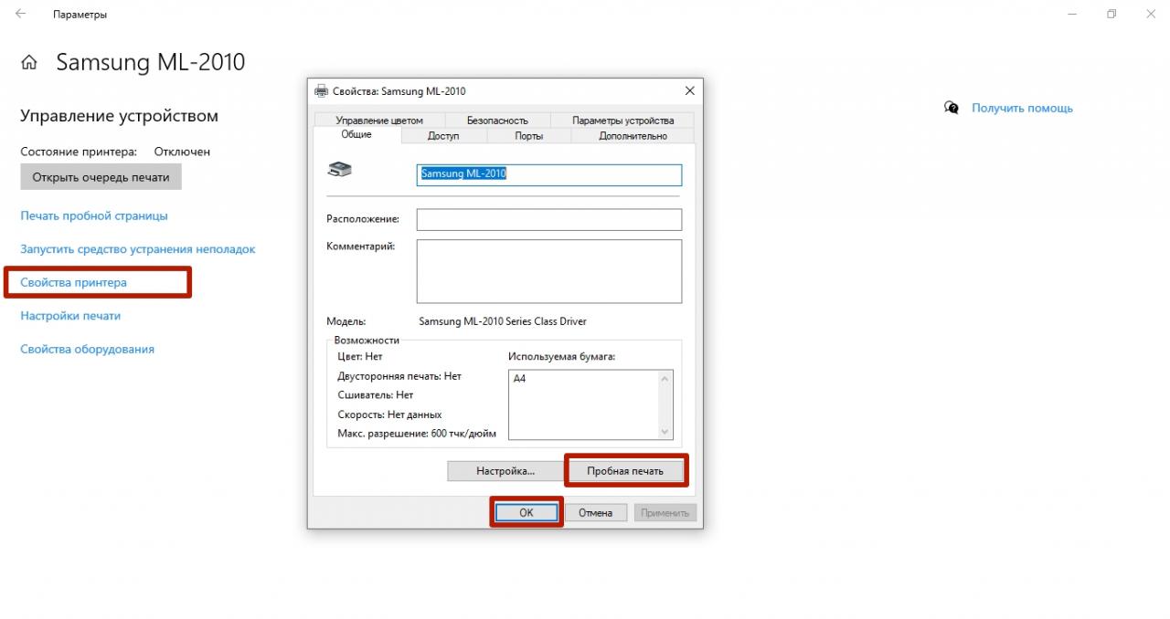 После сохранения настроек лучше всего произвести переподключение принтера, а уже потом переходить к повторному запуску печати, чтобы, повлияли ли новые параметры на отображение текста.