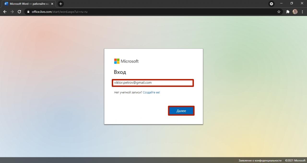 - Авторизуйтесь на сайте Microsoft — введите адрес электронной почты и нажмите «Далее». Если Вы не зарегистрированы, воспользуйтесь возможностью «Создать ее”.