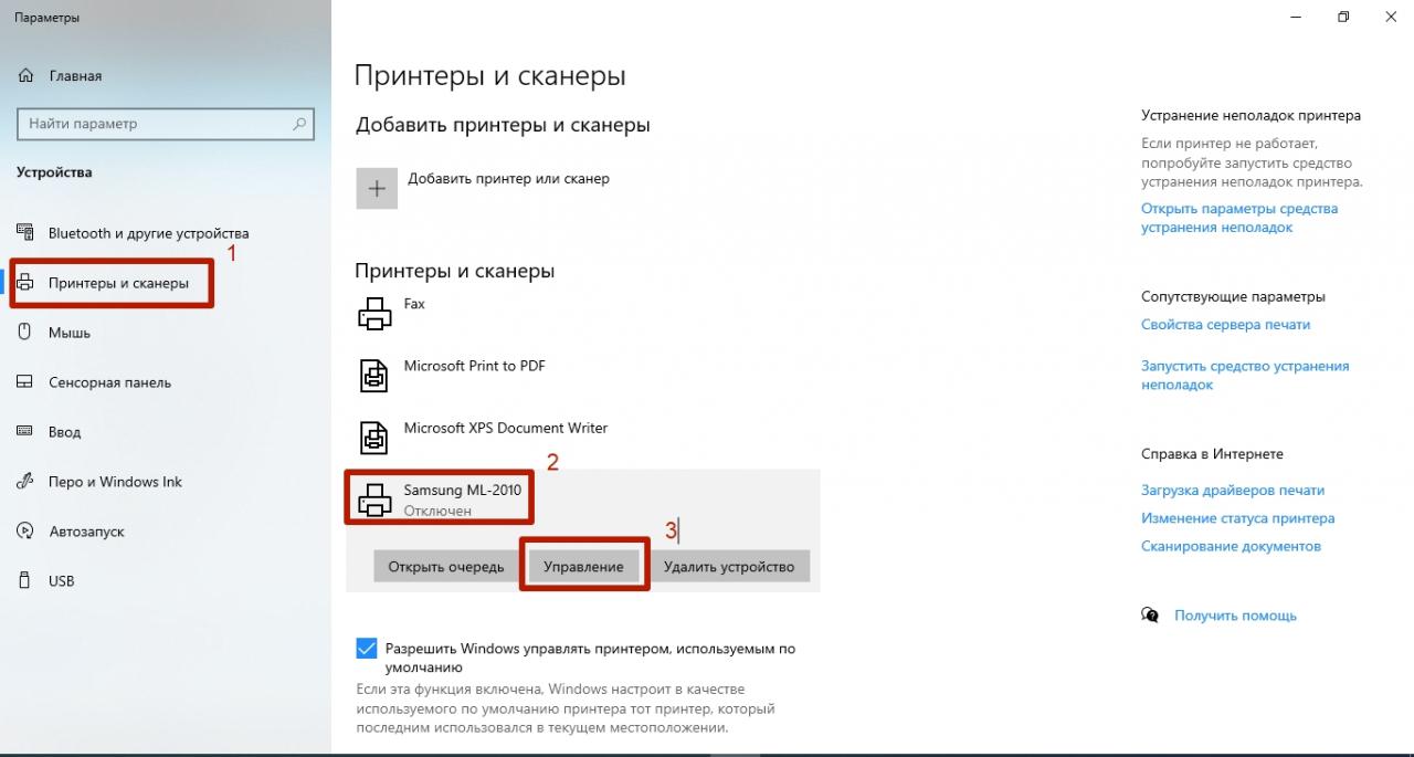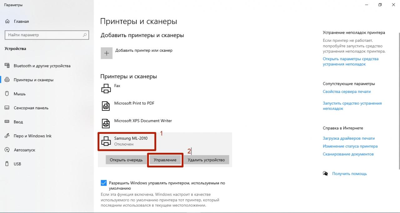 - Щелкните по кнопке «Управление», чтобы перейти к настройкам печатного оборудования.