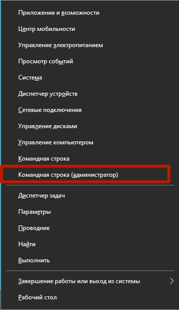 - Запустите командную строку. Это можно сделать сочетанием клавиш «Win + X» и последующим нажатием по пункту «Командная строка (админа)”.