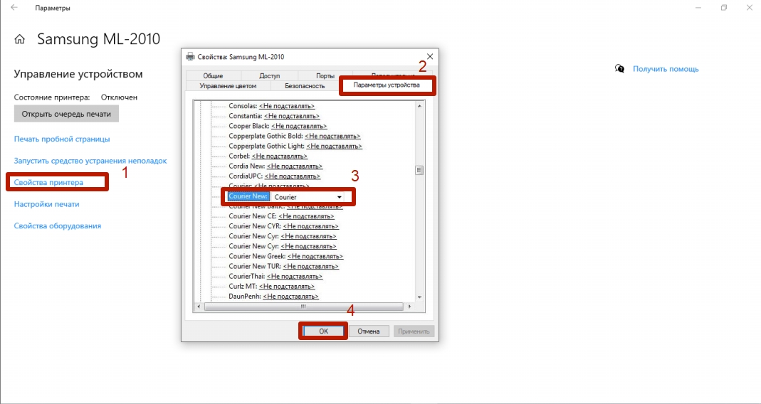 - Перейдите на вкладку «Параметры устройства». Если она отсутствует, значит, и функции подмены шрифтов в принтере нет.