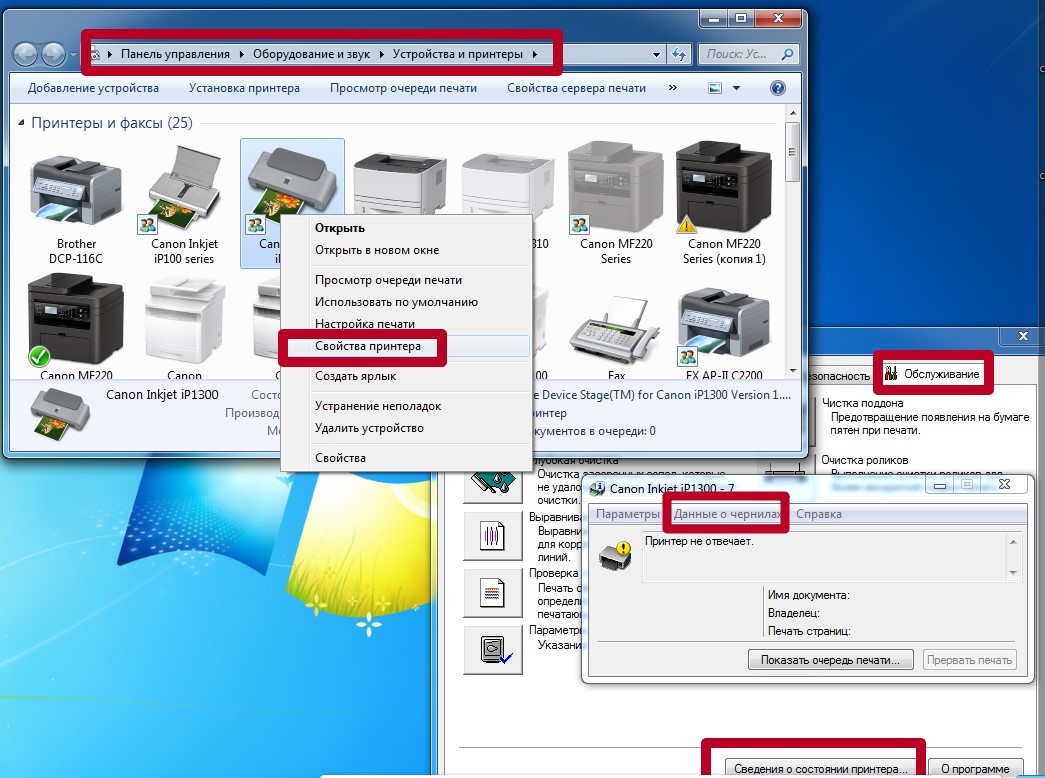 Для принтеров Canon функции чистки находятся во вкладке «Обслуживание» в «Свойствах принтера».