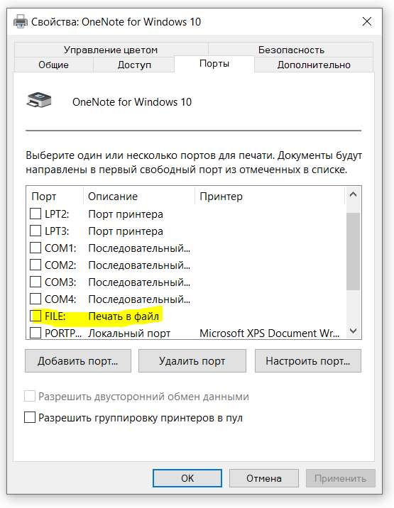 - Убедитесь, что напротив порта с названием «Печать в файл» нет отмеченной галочки.