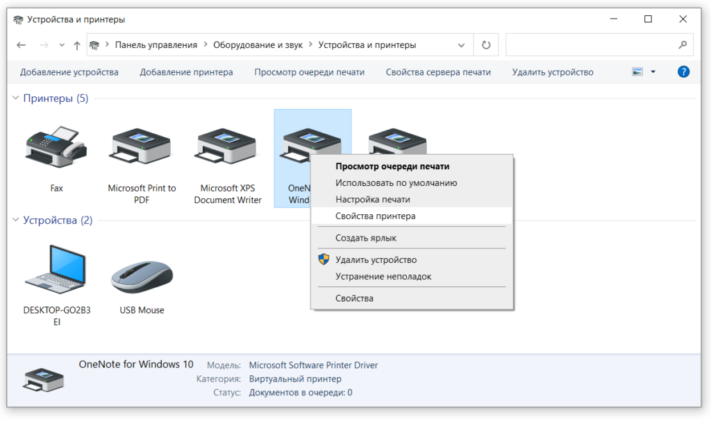Если оба способа не помогли, то ищем причину неисправности в смене порта, который присваивается при установке. Заходим в Панель управления Оборудование и звук Устройства. Нажимаем на свой принтер правой кнопкой мыши и выбираем в контекстном меню «свойства принтера».