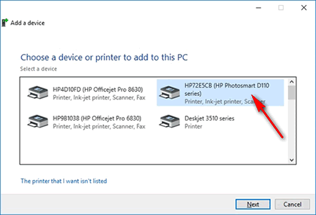- Если ваш принтер указан в списке, выберите его, нажмите кнопку «Далее», а затем следуйте инструкциям на экране для установки драйвера. Теперь можно использовать принтер.
