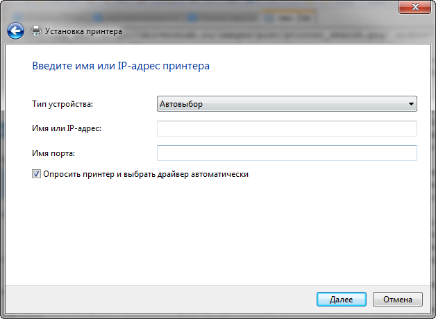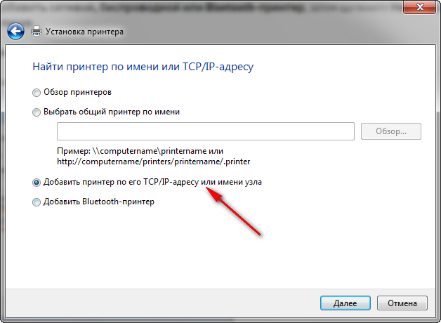 - Введите IP-адрес принтера в текстовом окне и нажмите кнопку Далее.