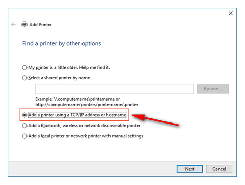 - Выберите «Добавить принтер при помощи TCP/IP или имени хоста», затем нажмите «Далее».